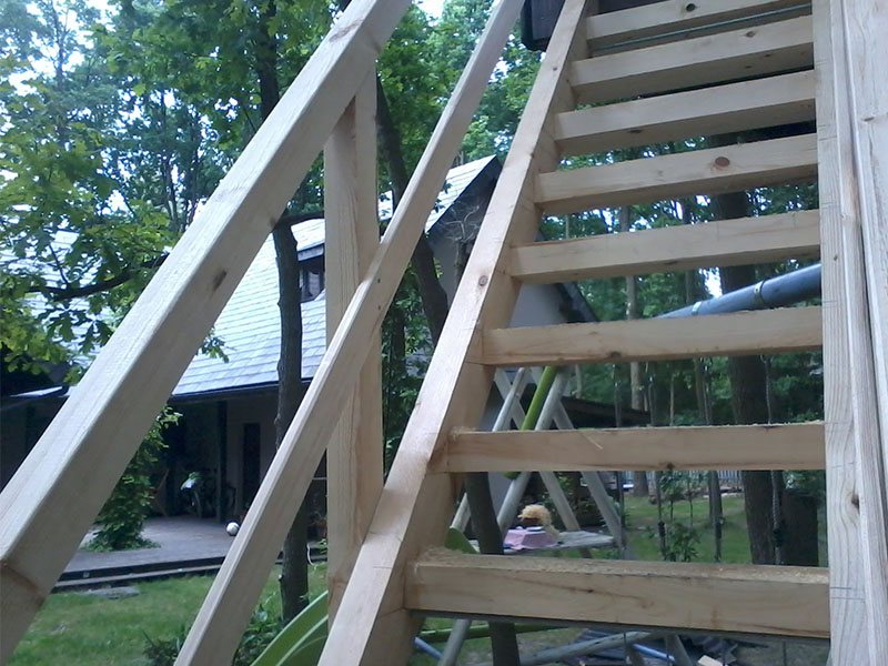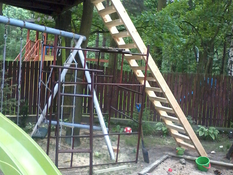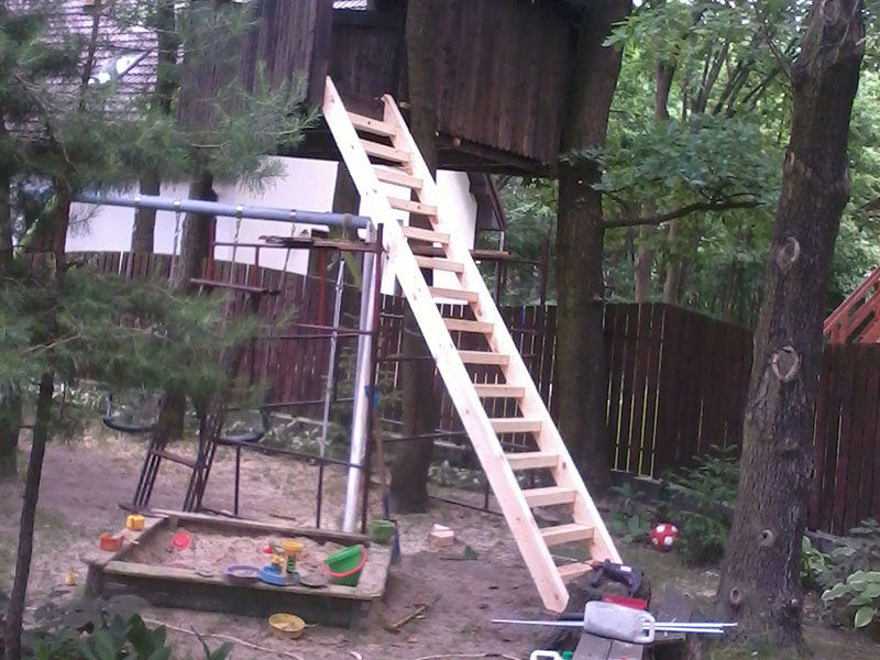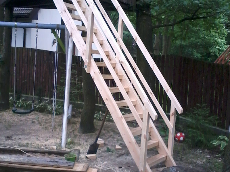 drewniany domek na drzewie - drewniane heblowane schody z por?cz?