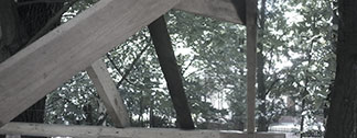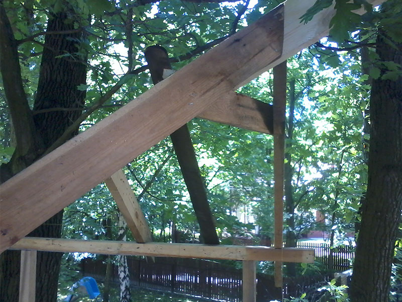 drewniany domek na drzewie - po deskowaniu ?cianek z pocz?tkiem konstrukcji schodów