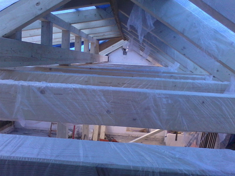 konstrukcja drewninanego heblowanego balkonu, docieplenie przed pokryciem
