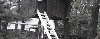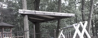 drewniany domek na drzewie z heblowanymi drewnianymi schodami